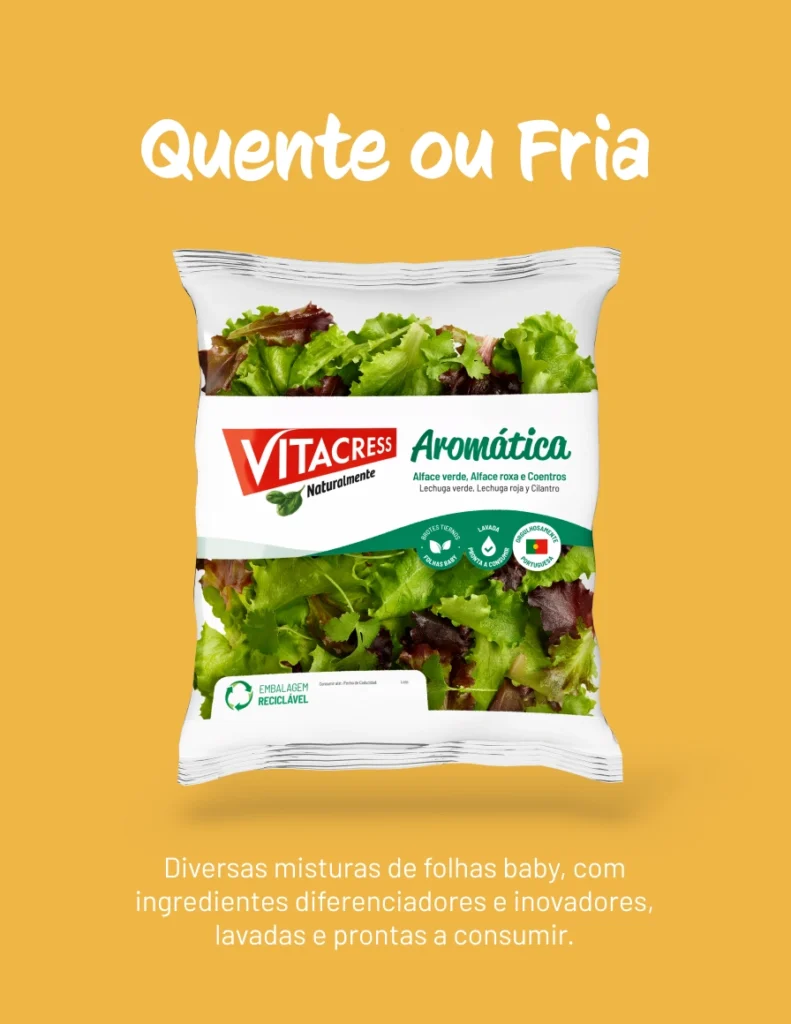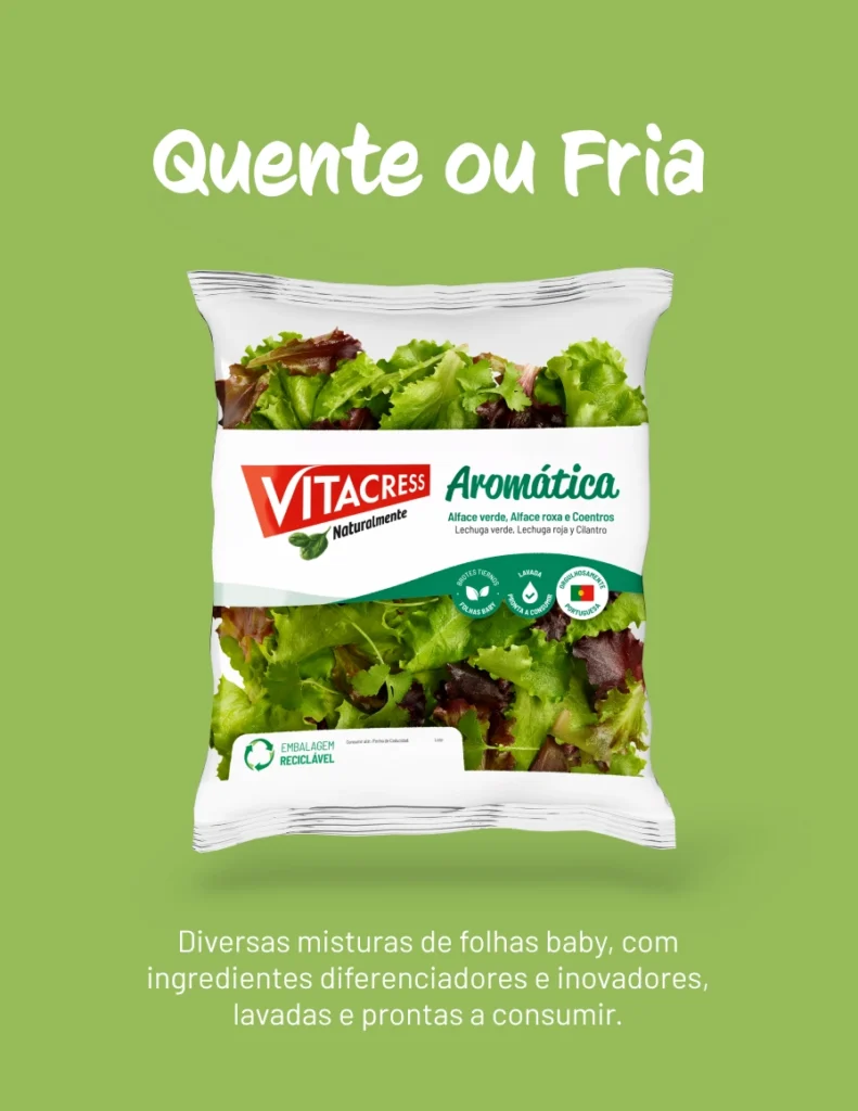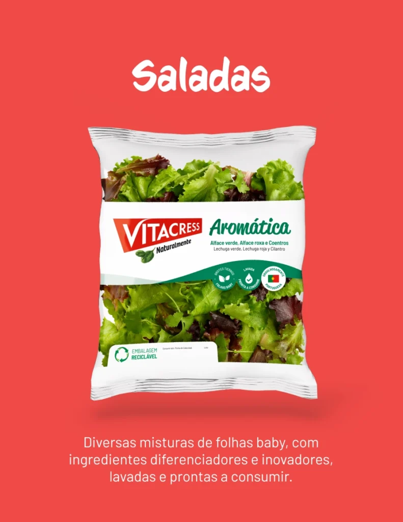 A essência da Vitacress está na produção de folhas baby, que são jovens, tenras, nutritivas e muito saborosas.